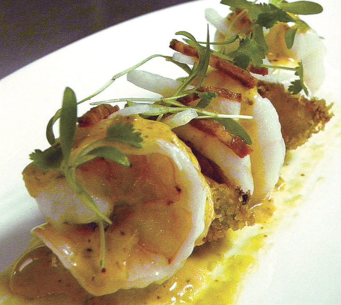 Small plate may sound ho hum but this is not your normal fare. Organized by one word categories of food genre, i.e. wild game, fish, duck, bread, pork and so on, the menu is easy to follow and not overly complicated, yet presents a sophisti- cated flavor profile. We started with the vegetable, a cold asparagus, shiitake mushroom beauty served atop a meyer lemon curd with lemon foam. Lemon done two ways was an interesting addition to the earthy vegetables; the acidic tart- ness of the light and airy foam acting as the perfect foil to the sweet and creamy curd that coated the plate. A jumbo crab cake followed that had no binder, just huge chunks of succu- lent crab with a thin coating of panko on the outside holding it together. A delicate basil oil and vibrant red pepper sauce took the cake up several notches. Miso Sea Bass in a delicate broth, Lo Mein Garlic Noodles with crunchy garlic chips throughout, and an amazing Truffled Gouda and Fig Jam cheese plate served with house made crackers were all out- standing but for me, the Black Tiger Shrimp and Quail dish- es completely blew the lid off the place. Expertly prepared shrimp tossed in a chipotle vinaigrette were served atop a sweet corn puree dotted with chorizo slivers, jicama and cilantro micro greens. The combination of smoky, sweet and spicy was superbly balanced and, simply put, sublime. The quail offering was equally outstanding. I have to say quail is not on my staple list of food items I order at the neighbor- hood watering hole, but this rendition was bold, yet some- how homey and comforting at the same time. Marinated with an achiote spice rub, the skin was caramelized and crispy while the meat remained moist and flavorful. Served atop a green chili spiked macaroni that provided a nice kick, it’s a go-to for any future visits.